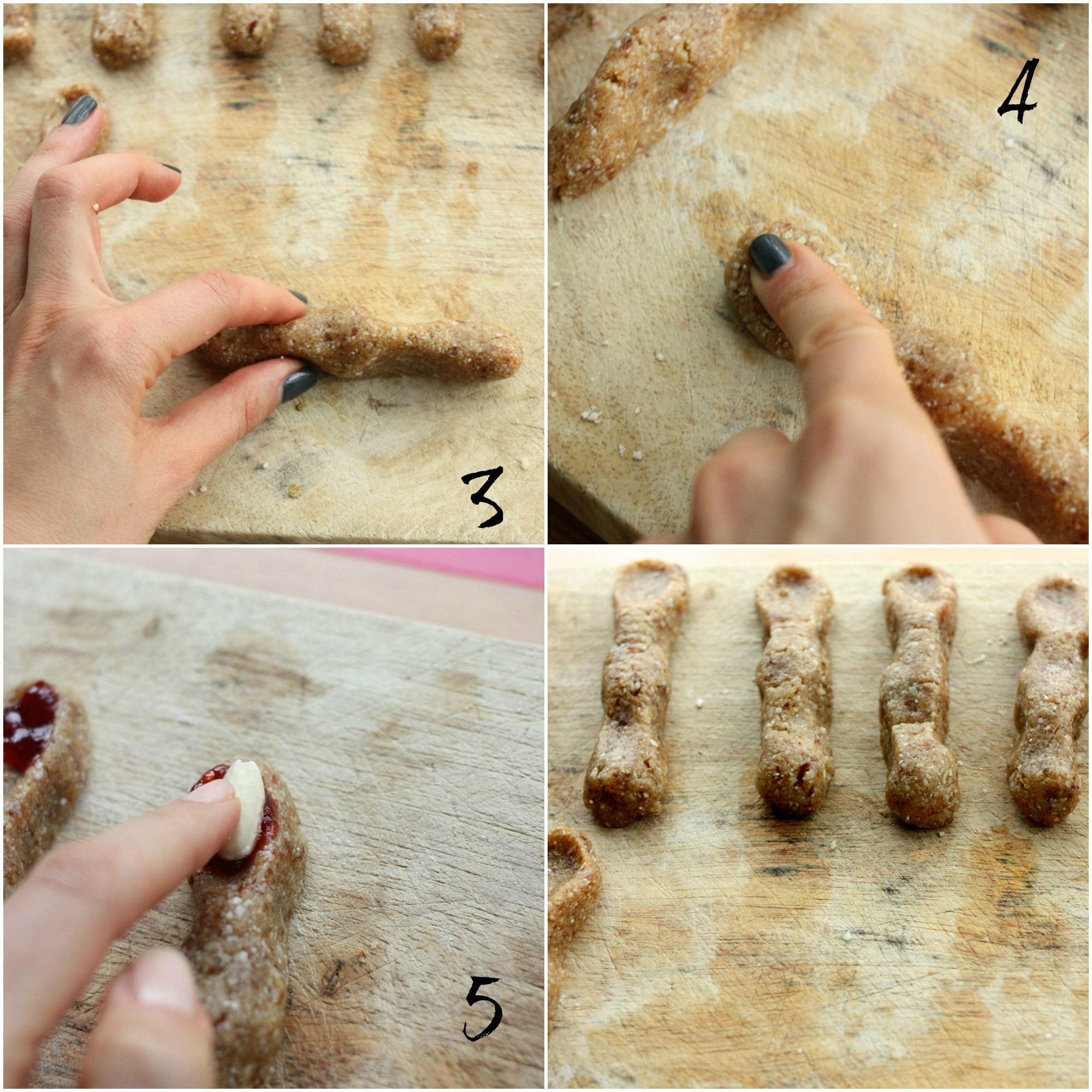 Agora já tem a massa pronta para fazer os dedos de bruxa. Pegue um pouco de massa e dê-lhe a forma de dedo usando as mãos. Uma vez que tenha conseguido uma forma idêntico a um dedo, achate um pouco a massa num topo para fazer a unha.