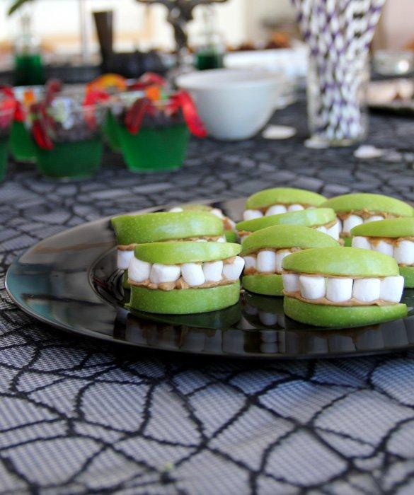 Corte as maçãs em fatias. Para o fazer, coloque a maçã sobre uma superfície na sua posição normal e com uma faca corte de cima para baixo de forma paralela, de maneira a simular a forma de lua minguante. Coloque manteiga de amendoim sobre cada lado da fatia da maçã que estará em contato e sobre este adicione os marshmallows simulando os dentes. E já tem as suas dentaduras de Frankenstein prontas para celebrar o Halloween!