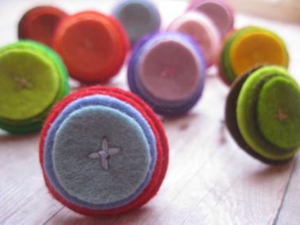 Outra boa ideia na hora de fazer anéis com feltro é adicionar botões ou outros acessórios. Para isso, deverá recortar o feltro ou diferentes feltros na forma que preferir: flores, estrelas, quadrados, etc. e com a ajuda de agulha e linha, costurar as diferentes peças.