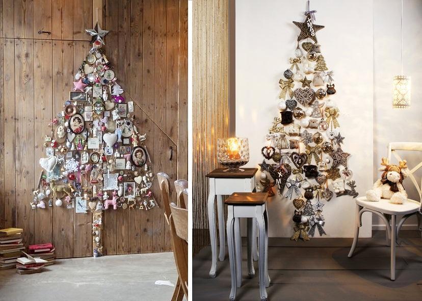 Não podemos deixar de incluir na nossa lista de árvores de Natal originais, estes designs colocados na parede tão bonitos e surpreendentes. Pode optar por o fazer com diferentes materiais reciclados ou com os tradicionais enfeites natalinos que usa habitualmente, como é o caso da árvore da segunda imagine. Tenha estes como referência e crie a sua própria árvore no espaço da casa que preferir.
