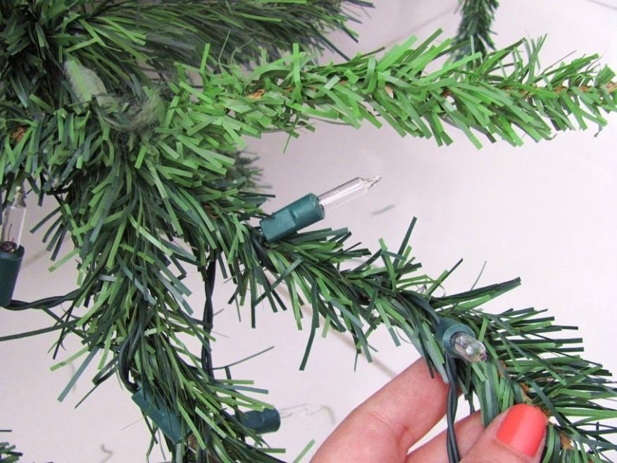 Uma vez feitas todas as verificações, já podemos começar a colocá-las. Comece sempre a partir de cima. Assim, ate o extremo do cabo à ponta da árvore e comece a colocá-lo à volta da árvore, como em forma de espiral.