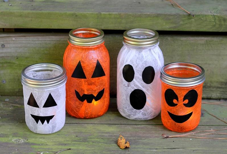 Para iluminar a mesa de Halloween também pode utilizar velas ou fazer lanternas de Halloween. Pode fazer as lanternas reutilizando frascos de vidro, garrafas de leite e até copos de plástico. Basta pintar o frasco da cor que desejar, desenhar um rosto assustador em cartolina preta, recortar e colar no frasco. Bem simples e fica com uma decoração de Halloween bem original!