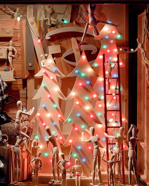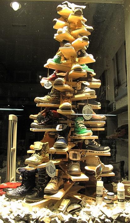 Outra ideia para decorar a sua vitrine neste natal é utilizar os seus próprios produtos para recriar elementos natalinos como a árvore de natal. Se a sua loja vende por exemplo sapatos, pode fazer uma árvore de natal com eles. Na imagem tem um exemplo bastante interessante que pode aplicar não só em sapatos mas também por exemplo para lojas de artigos para o lar.
