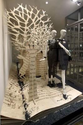 No caso de papelarias ou livrarias, a decoração da vitrine pode ser feita utilizando os próprios jornais ou páginas de livros. Com jornais antigos pode desenhar e recortar elementos natalinos e colar na sua vitrine, conseguirá um resultado bastante original. No caso de livrarias pode fazer uma árvore de papel com letras, simulando uma página de um livro.