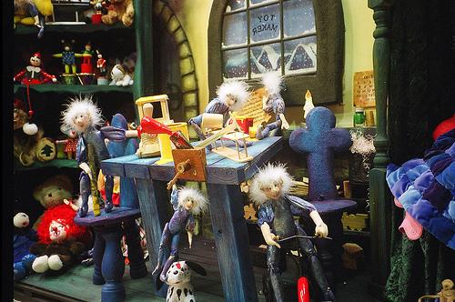 Em lojas de brinquedos convém chamar a atenção das crianças, pois vão ser elas que vão pedir para os pais entrarem na loja e escolher aquilo que querem receber no natal. Pode utilizar os brinquedos da loja e recriar por exemplo a fábrica de brinquedos com os duendes envolvendo as crianças num ambiente de magia. Outra ideia que também pode funcionar em vitrines de lojas de brinquedos é recriar algum cenário de um filme recente como o Frozen, que teve um grande sucesso e por se passar na neve oferece inúmeras possibilidades de decoração de natal.