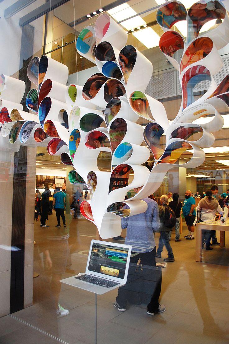 Para decorar uma vitrine de uma loja de informática, pode fazer uma árvore de natal como no exemplo da foto. Faça a árvore com folhas de imagens e coloque em baixo uma impressora ou um portátil, vai parecer que essas imagens foram imprimidas da impressora ou feitas no portátil. Uma forma bem legal de publicitar os seus produtos e decorar a sua vitrine neste natal.