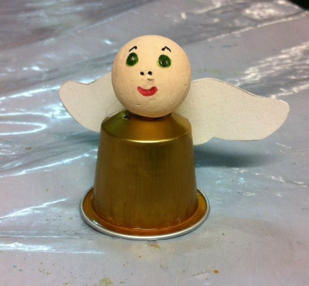 Outra forma de fazer anjos natalinos é reutilizando cápsulas de café. Limpe bem a cápsula de café e cole na parte de trás do anjo as asas. Pode desenhar as asas em feltro, eva ou cartolina, recortar e colar. Para a cabeça pode utilizar uma bola de isopor e pintá-la a seu gosto. Com pedacinhos de lã pode simular os cabelos do anjinho.