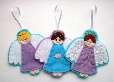 Também pode fazer originais anjos natalinos utilizando feltro. Desenhe todas as partes do seu anjo em feltro colorido, as asas, o corpo, o rosto e o cabelo. Depois basta unir todas as partes e ir costurando o seu anjo. Para fazer os olhos e a boca pode costurar com linha preta.