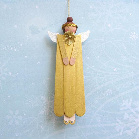 Pode fazer um anjo natalino utilizando palitos de picolé. Para isso, o ideal seria ter palitos de picolé um pouco mais grossos para fazer o corpo e 4 mais finos para fazer as pernas e os braços. Tudo o que precisa fazer é pintar a seu gosto os palitos e colá-los da forma que mostra a imagem. Depois com cartolina ou EVA pode desenhar duas asas e colá-las na parte de trás do anjo. Para fazer a cabeça do anjo pode utilizar uma miçanga daquelas grandes de madeira e colá-la aos palitos de picolé. Depois pinte o rosto na miçanga e passe um fio ou corda no meio para pendurar o seu anjo natalino.