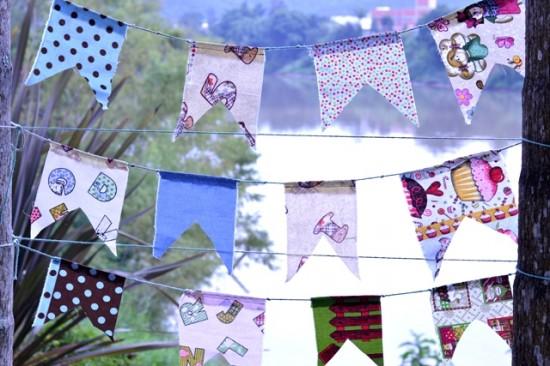 - Os tecidos também são uma ferramenta incrível para variar o visual das bandeirinhas e ainda deixá-las reutilizáveis para outras festas. As cores e estampas ficam a critério da festa, vale misturar ou fazer tudo combinando. Estampas xadrez, florais e até jeans sempre geram um efeito especial;
