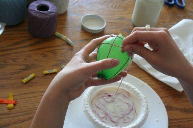 Agora, em um pequeno recipiente, dilua a cola branca em um pouco de água e mexa até obter uma mistura homogênea. Passe o barbante por essa mistura, de forma a ficar bem molhado.