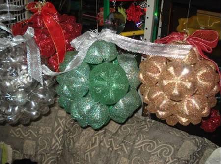 Se você gostou das bolas de papel de jornal com certeza vai adorar estas. São uma excelente forma de ajudar o meio ambiente reciclando materiais e promovendo o conceito da reciclagem. São muito fáceis de fazer, separe 12 garrafas pet e leia o nosso artigo Como fazer bolas natalinas de garrafas pet para ver o resto dos materiais e todos os passos.