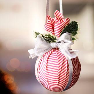 Com tecido. Quando o 25 de dezembro começa se aproximando as lojas de artesanato e de tecidos começam vendendo lindos e variados tecidos com motivos de Natal. que dão vontade de comprar e usar por toda a casa! Compre um metro dos seus preferidos e use-os para fazer bolas de Natal da seguinte forma: estenda o tecido sobre uma superfície plana, com o forro para cima, e coloque no centro uma bola de isopor; embrulhe a bola com o tecido e amarre bem com um laço de cetim.