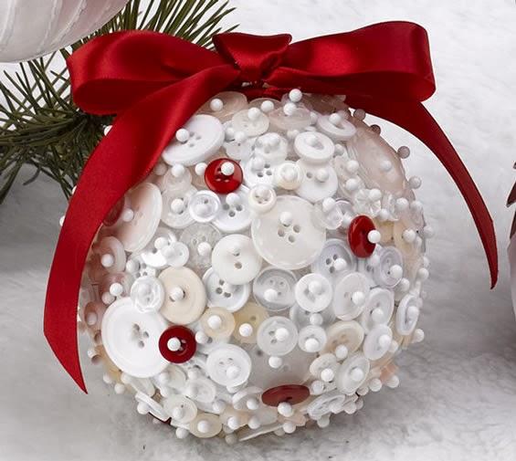 Com botões. Sabe aqueles botões que você tem vindo a acumular ao longo dos anos sem saber por que razão? Agora pode finalmente lhes dar uso e fazer uma bonita bola natalina! É muito simples: coloque os botões na bola de isopor e espete um alfinete de cabeça em um dos orifícios de cada botão. Repita até preencher toda a área da bola, tal como no exemplo ao lado. Prefira usar botões de cores relacionadas com o Natal, como vermelho, branco, amarelo e verde.