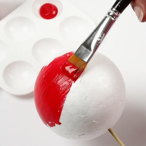 Com tinta. Outra dica para decorar bolas de isopor para o Natal de forma muito rápida é usando tintas! Essa será uma ótima atividade para as crianças, pois elas adoram pinturas e participar das decorações natalinas. Espete um palito de churrasco na bola e pinte o isopor com guache, tinta para tecido, acrílico ou látex na cor desejada; espere secar e, com um pincel mais fino, desenhe símbolos de Natal.