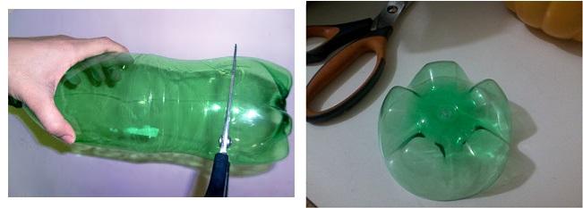 Comece por furar o fundo da garrafa com um estilete e depois recorte à volta com a tesoura. Faça isso nas 12 garrafas até obter 12 fundos de garrafa pet. Corte todos os fundos do mesmo tamanho, uma dica é recortá-los pela marca que há na parte de baixo da garrafa.