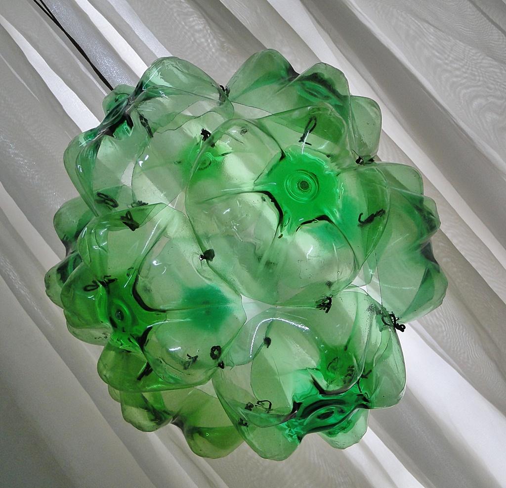 Se você quiser que sua bola natalina fique de outra cor, deverá pintar os 12 fundos antes de os unir uns aos outros com esmalte vitral. Para conseguir pendurar depois a sua bola natalina, deverá fazer dois furos a mais em algum dos fundos e passar uma corda ou fita. E já tem a sua bola natalina de garrafa pet pronta para decorar a sua casa neste natal!