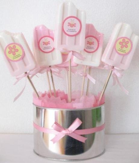 Pode fazer chupetas ou anjinhos com papel ou cartolina e colar em um pau de madeira. Desenhe e recorte-os, e, pela parte de trás, coloque adesivo colando ao pau de madeira. Assim, podem ser fixados junto ao resto das flores e aos espetos de doces.