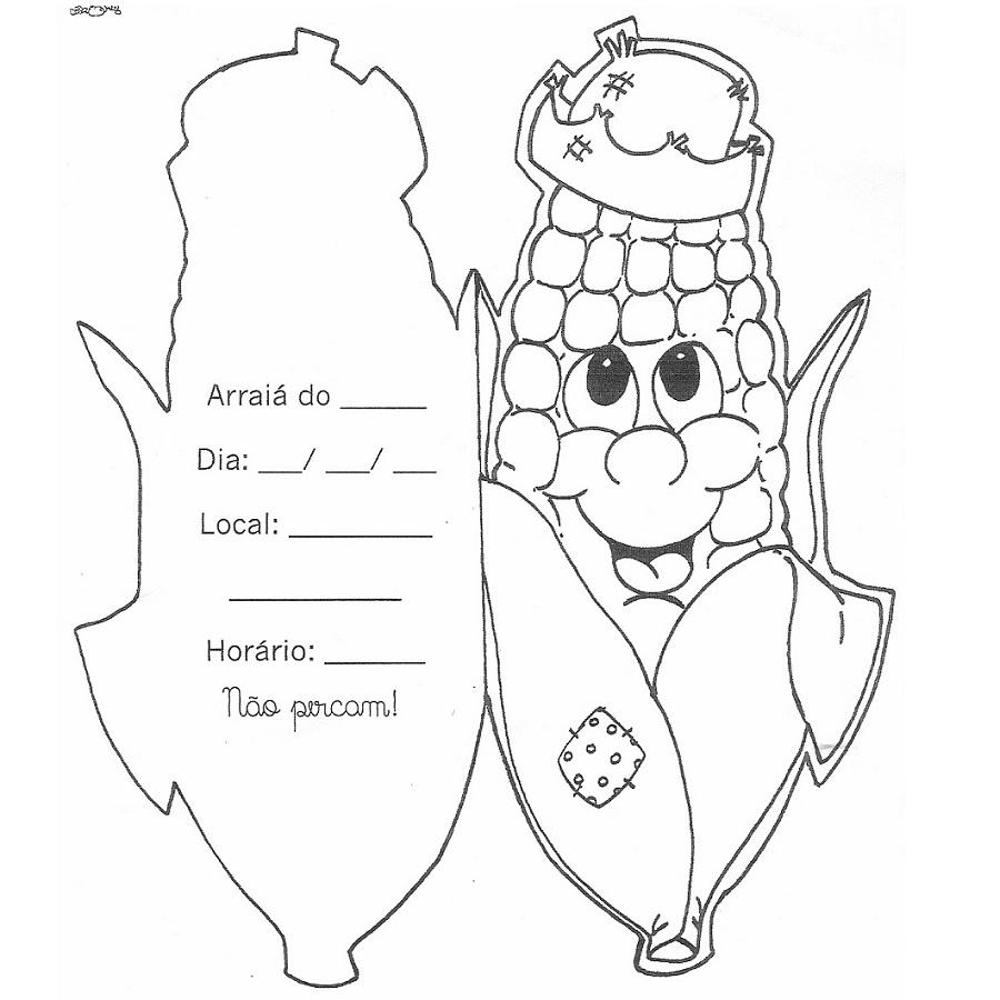 Um convite bem divertido será um em forma de maçaroca de milho. Se você tiver jeito com desenho poderá desenhar uma em uma cartolina, caso contrário use o molde da imagem ao lado. Colore-o da forma que mais gostar, ou então dê-o a suas crianças para elas o pintarem, o que se irá revelar uma atividade bem divertida e uma possibilidade de ter convites customizados. Recorte de acordo com os contornos e insira no interior/parte traseira as informações relativas à festa.