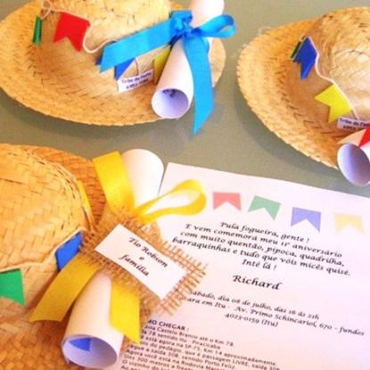 Será uma ideia bem criativa se o seu convite para festa junina aparecer enrolado em um chapéu de palha, como se de uma mensagem secreta ou muito importante se tratasse. Se você tiver um orçamento largo para realizar a festa junina, compre chapéus de tamanho real para transportar o convite e fazer com que seus convidados os usem na festa, se não simplesmente compre os chapéus de formato mini, que poderá encontrar em lojas de artesanato, e prenda neles um papel enrolado com a mensagem escrita à mão no interior.