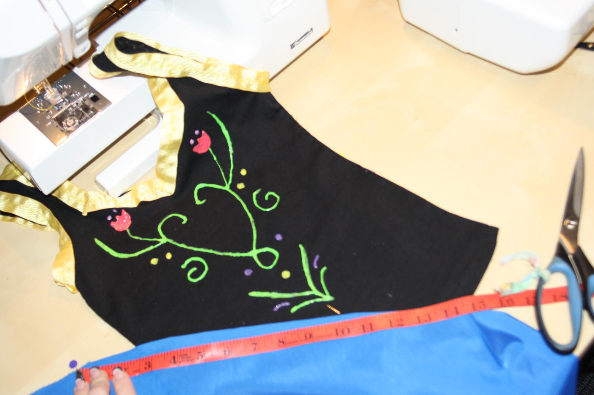 Para fazer fantasia de Anna Frozen, comece por costurar o cetim azul (com formato retangular) no fundo e no cós, deixando uma abertura para passar o elástico. Para um efeito mais rodado, coloque um saiote por baixo ou faça uma saia godê. Use uma vela para fazer a bainha. Se quiser, pode pintar as flores da personagem na bainha.
