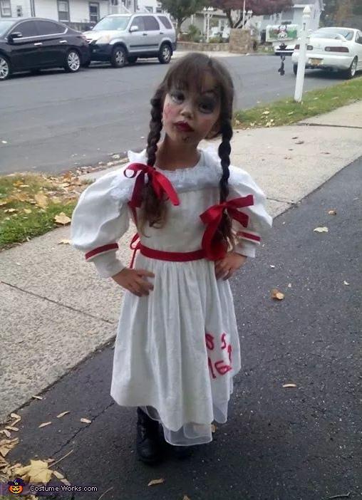 Porém, não é só o vestido. Para fazer corretamente a fantasia de Annabelle, é importante ter um cinto vermelho largo para caracterizar adequadamente a roupa da personagem. Se possível, fazer uma flor de pano grande para dar a impressão da personagem original, que possui este largo cinto que dá o tom sanguinário ao seu personagem, como se vê na foto abaixo.