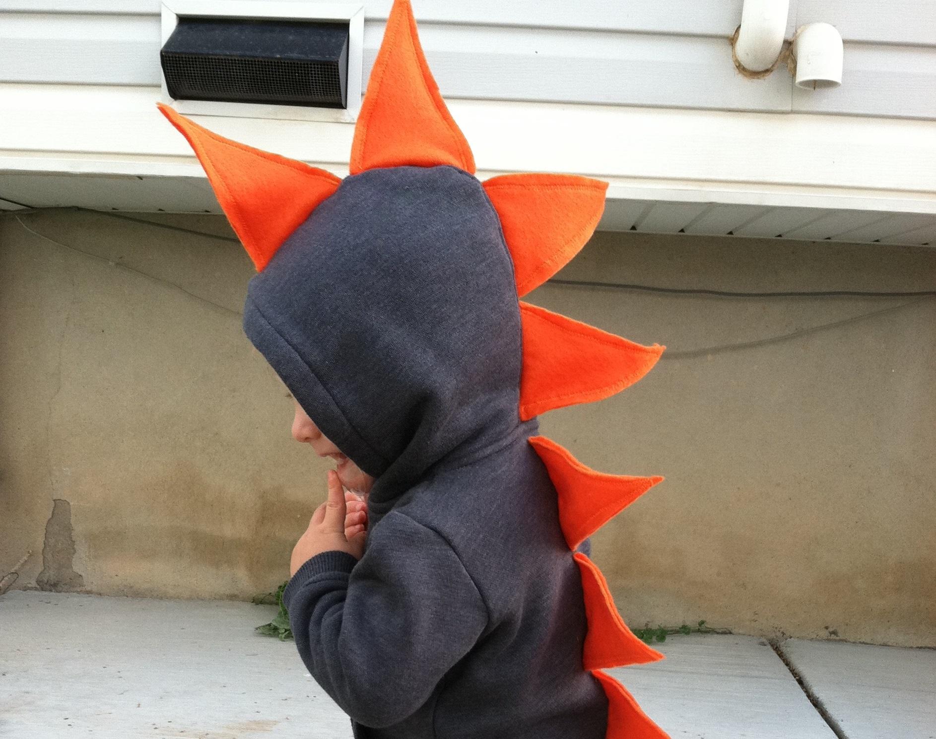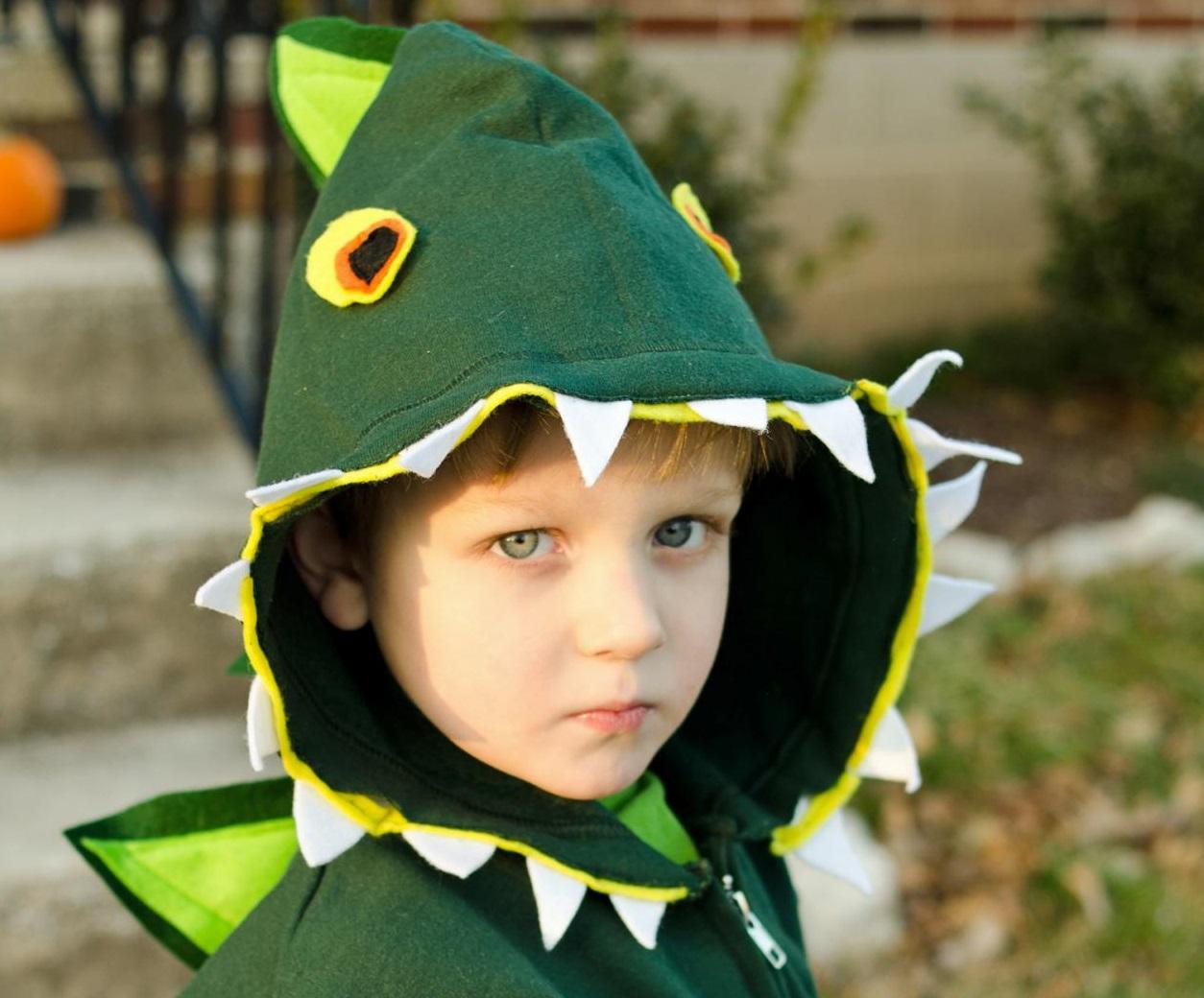 Se não se importar de abdicar das mangas do moletom, pode ainda criar um rabo de dinossauro. Para isso, corte as duas mangas e use uma delas para fazer a cauda do animal. Use a costura central como referência para o corte. Corte o tecido de forma a criar o formato de causa pontiaguda e costure os dois lados, unindo-os.