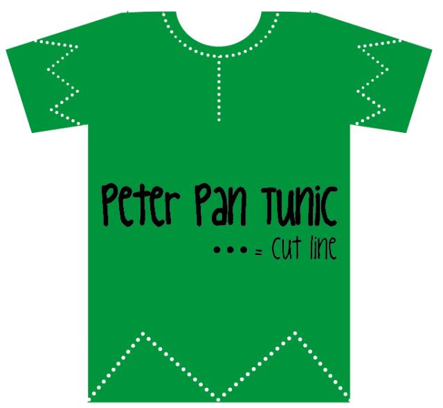 Basta conseguir uma camiseta verde que seja comprida o suficiente de maneira a ficar uma saia. Depois você deverá cortar à volta da camiseta seguindo o tracejado da imagem. Pode começar pela gola, cortando em formato de "V". Depois pode seguir para as mangas da camiseta, que deverá cortar em forma de bicos. Caso as mangas da camiseta sejam demasiado compridas, considere cortar um pouco o comprimento antes de avançar para o corte em bicos. E, por último, deverá cortar o final da camiseta também criando vários "V", pode fazer quantos quiser mas lembre-se que no filme a túnica de Peter Pan tinha apenas alguns. Para finalizar a sua túnica de Peter Pan, pode fazer uma bainha nos locais que cortou ou deixar assim mesmo, caso não queira perder mais tempo ou não saiba costurar.