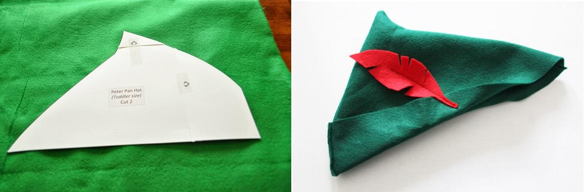 Comece por fazer um molde para o chapéu de Peter Pan em papelão ou cartolina, seguindo a forma da imagem. As dimensões vão depender da cabeça da pessoa que o usar, por isso faça antes a medição do comprimento que quer o chapéu tenha para ter uma ideia. De seguida, corte 2 moldes iguais e costure apenas o lado esquerdo e o direito do triângulo, sendo que do lado direito deverá costurar até onde a linha começa a ficar direita. Depois dobre a parte do chapéu que não costurou de maneira a fazer uma aba. Consiga uma pena vermelha ou faça uma você mesmo com feltro vermelho e cole na lateral do chapéu e já tem o chapéu de Peter Pan pronto.