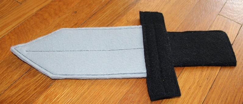 Comece por fazer um modelo de uma espada no papelão e corte. Use esse molde para recortar pedaços de feltro em preto e cinza. Depois forre esse modelo com os pedaços de feltro, sendo que o feltro cinza é para a parte da espada em si e o preto para a parte que segura a espada. De seguida, cole esses pedaços ao modo de papelão desta forma a espada ficará mais resistente. Por último, e se desejar, poderá cortar uma fita de feltro preto, enrolar e colar na parte para segurar a espada. Assim se quiser poderá prender a espada ao cinto da fantasia. Caso não queira ter este trabalho e disponha de orçamento suficiente, considere comprar uma espada de plástico em uma loja de fantasias.