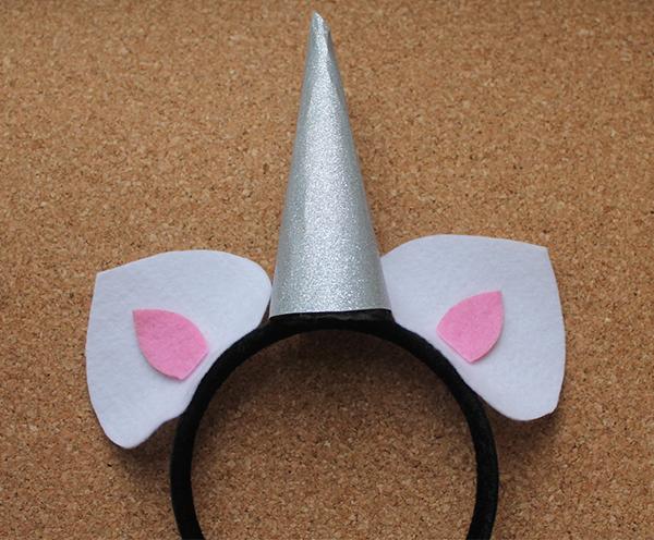 - Faça um cone com cartolina e pinte-o e decore-o com bastante glitter e purpurina, deixando-o colorido e similar ao chifre de um unicórnio.