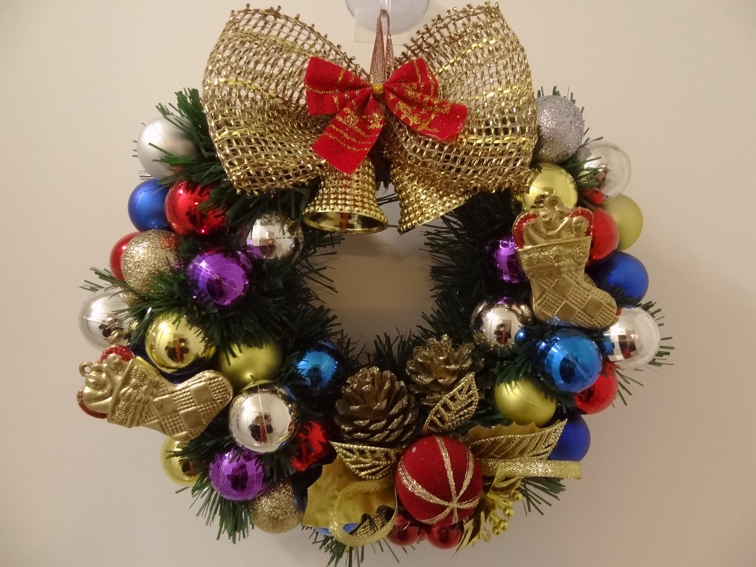 Continue colando todos os objetos na sua guirlanda e garanta que nenhum espaço fica sem enfeite. Isso vai esconder a guirlanda de isopor, que é um dos seus objetivos.