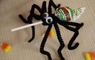 Outro dos elementos que não podem faltar nas festas de Halloween são as aranhas e, com elas podemos fazer magníficas lembrancinhas. Você pode fazer um pirulito de aranha como lembrancinha. Para isso, basta forrar o pirulito com papel de seda e comprar as patas de aranha já feitas em lojas de armarinho.
