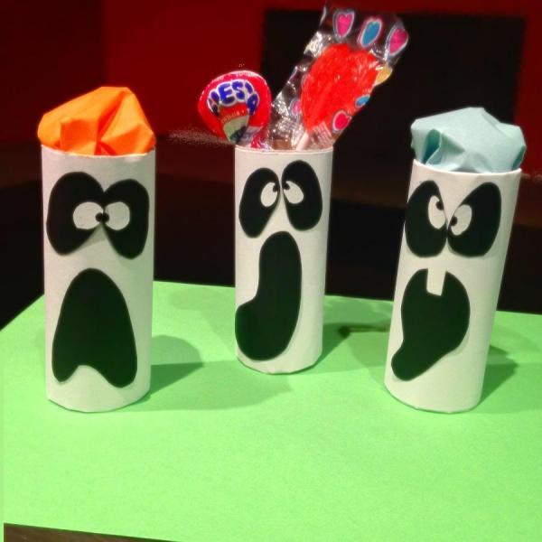 Outra opção para as lembrancinhas de Halloween é fazer um recipiente para doces em forma de fantasma. Tudo o que você precisa para fazer esta lembrancinha é de um tubo de papel higiênico, cartolina branca e preta e doces para colocar no interior. Veja o passo a passo de como fazer um recipiente fantasma.