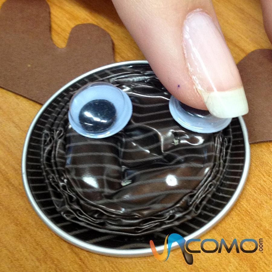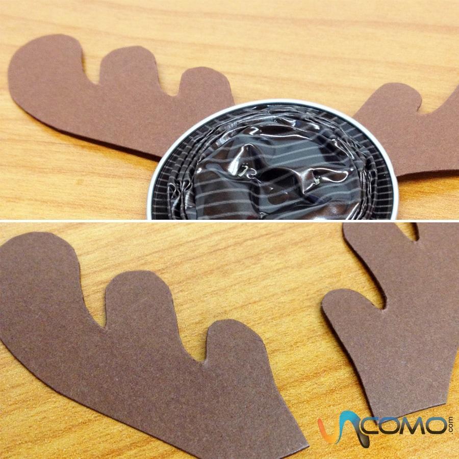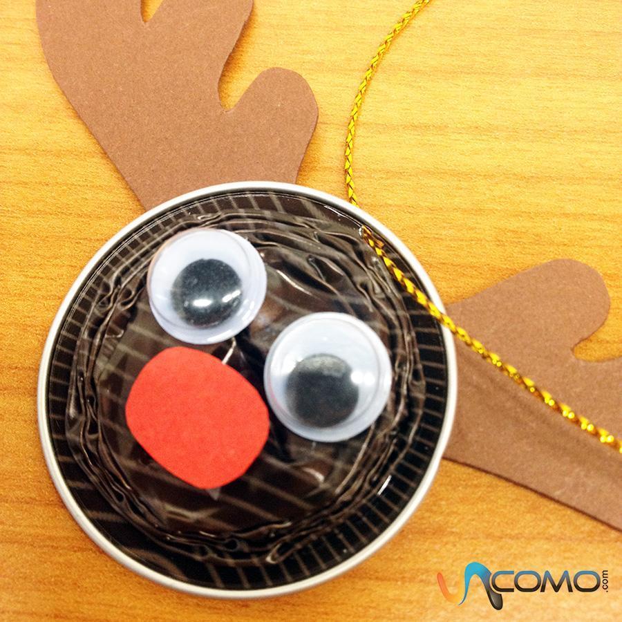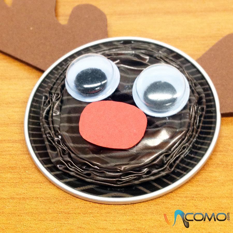 De seguida, para os olhos da rena com cápsulas de café pode comprar uns olhos móveis para trabalhos manuais como os que utilizamos ou desenhá-los você mesmo com papel branco. Pouco a pouco o nosso trabalho manual para o natal vai ganhando forma de rena.