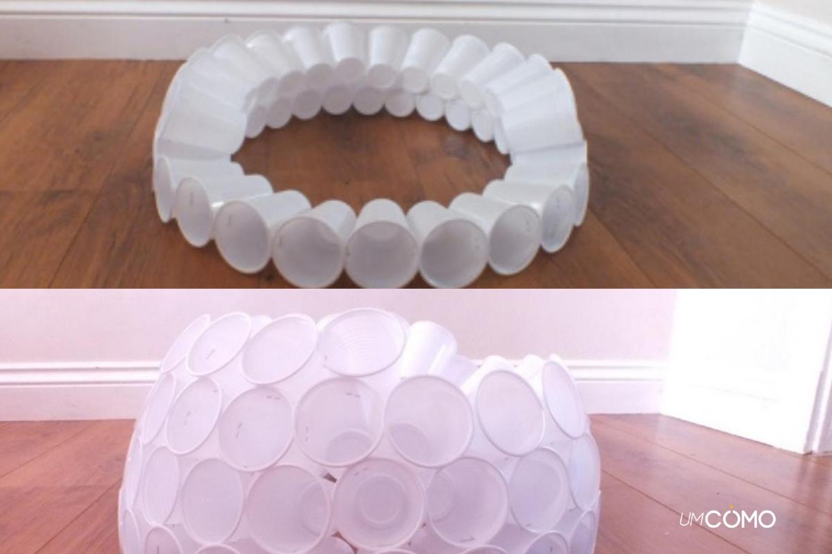 Agora que você tem a sua meia esfera feita com copinhos, deve repetir o processo, unindo os copos até formar 5 novas camadas: que vão formar a outra metade da sua esfera. A ideia é que você finalmente vai poder unir ambas as metades até completar a esfera.