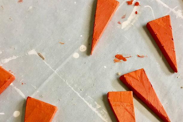 Seguindo com as cartolinas, é hora de fazer os olhos, o nariz e a boca do boneco de neve. Tradicionalmente, o nariz do boneco é feito com uma cenoura, e é por isso que recomendamos que você o faça com uma cartolina laranja, em forma de triângulo. Outra opção é cortar pequenos triângulos de argila laranja para criar um nariz mais realista. Use sua imaginação!