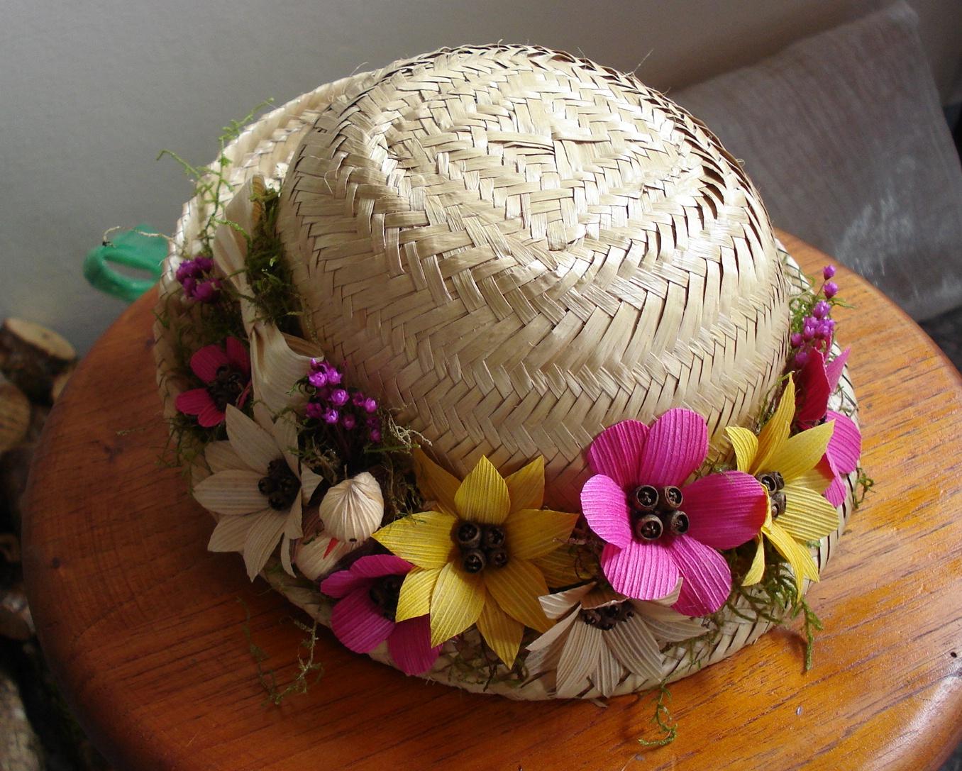 Adicione outros acessórios. Cole mais flores na borda do chapéu, junto com outros acessórios. Estes podem incluir ovos de plástico, frutas de plástico, pequenas aves, coelhos ou pintainhos de peluche, pauzinhos de cores, alfinetes de enfeitar, enfeites de plástico ou de vidro, pedaços de jóias quebrados ou strass. A sua imaginação é o único limite nestes acessórios.