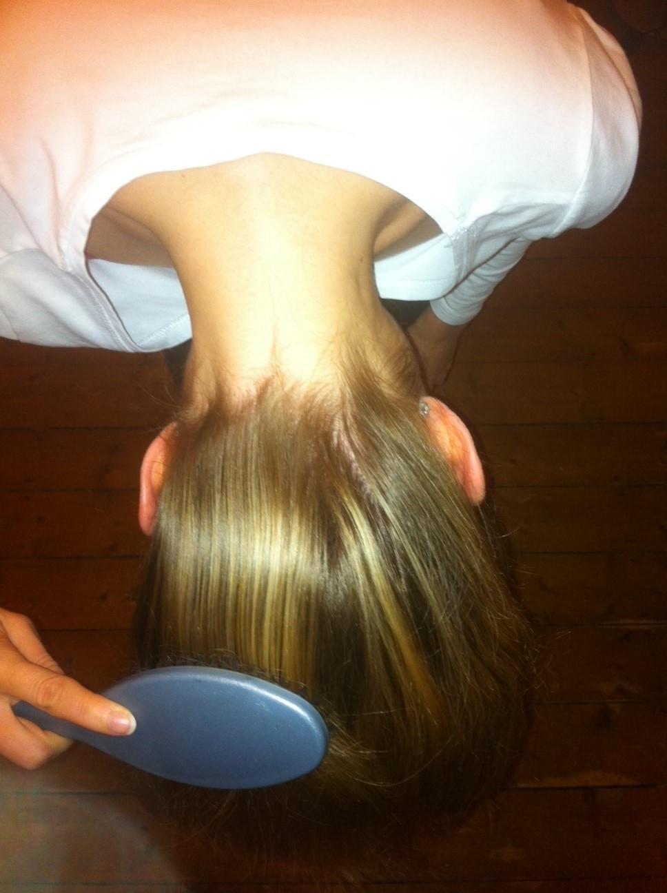 Primeiro coloque a cabeça para baixo e penteie bem o cabelo para que não fique embaraçado.