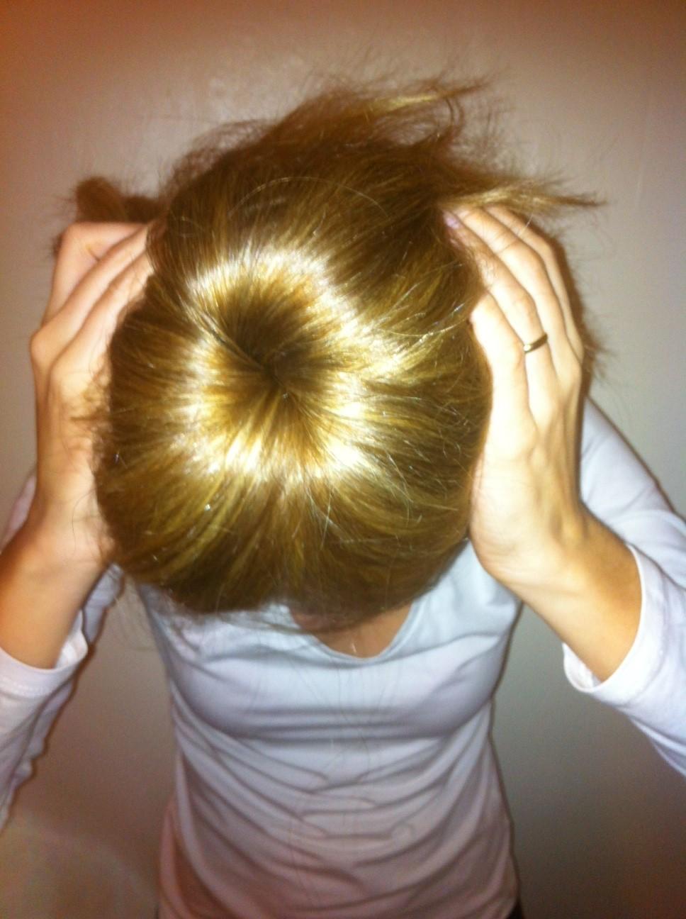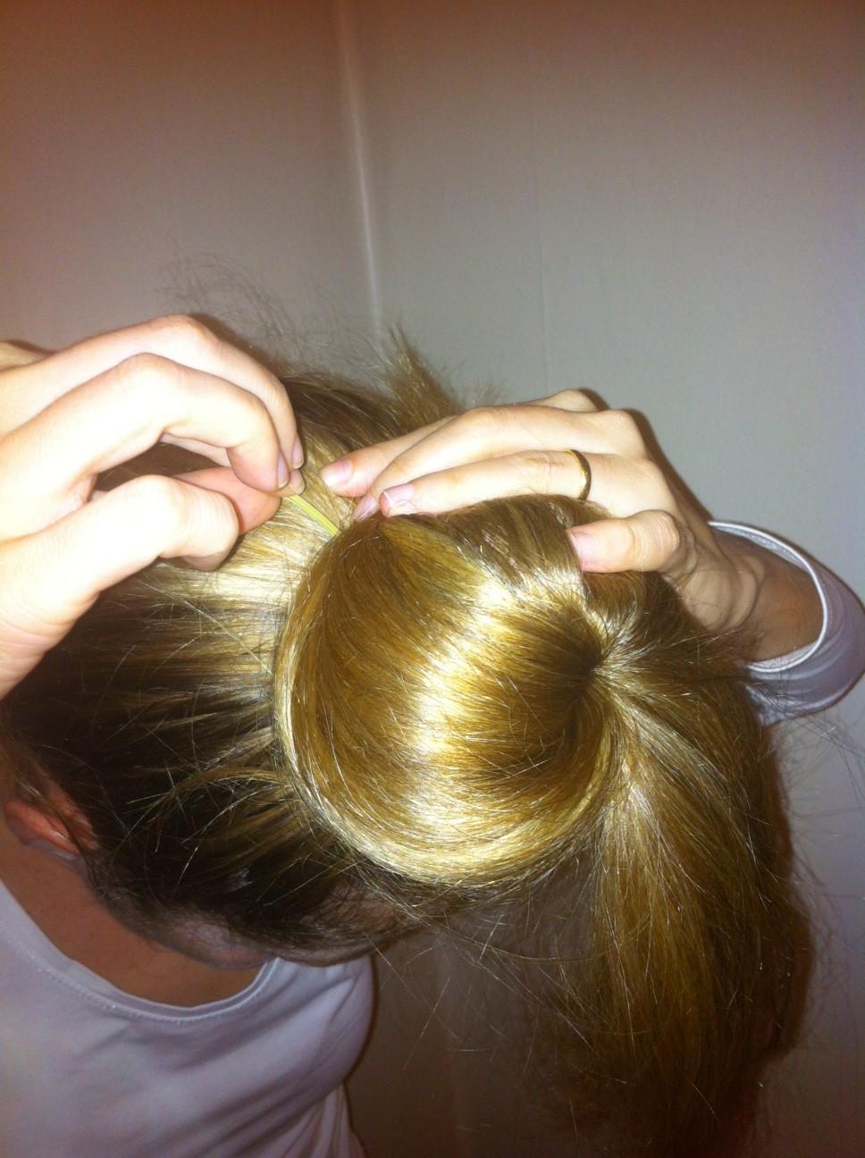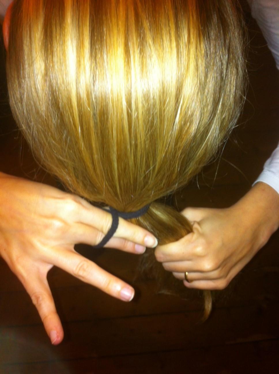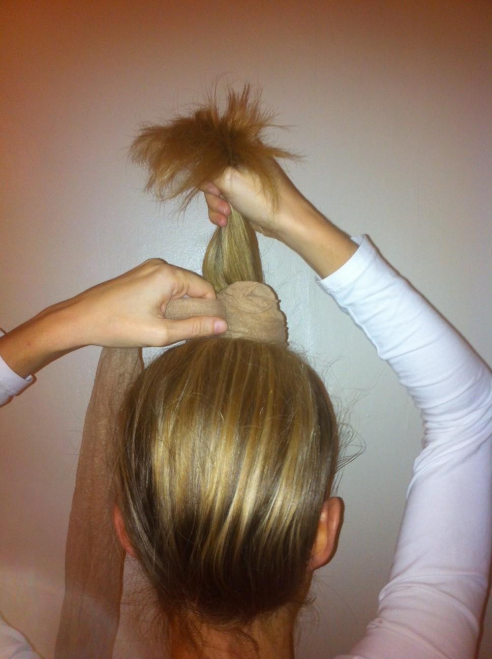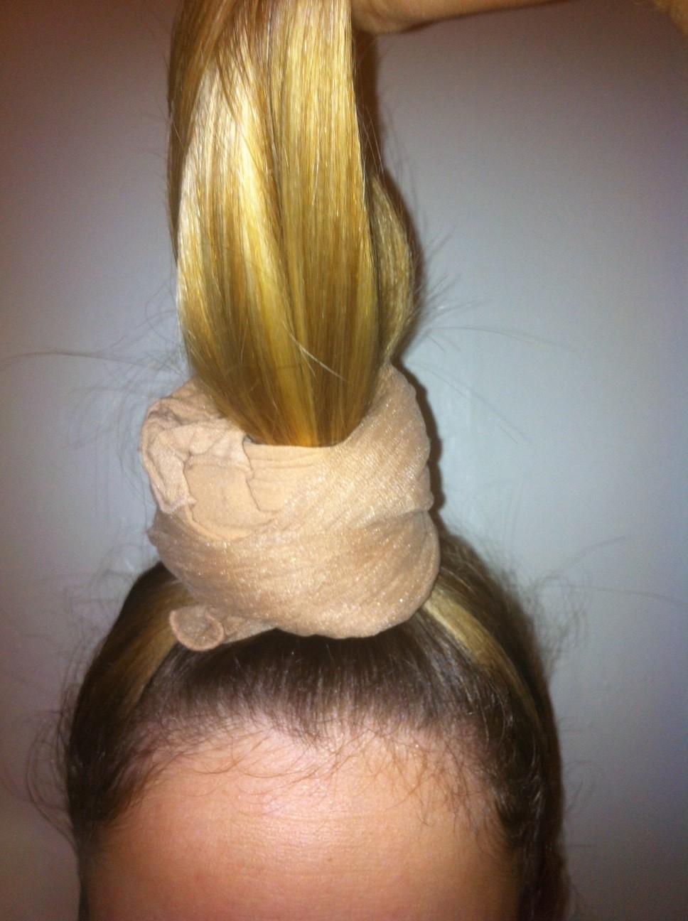 O rabo-de-cavalo deve ficar assim alto (veja a fotografia). Pegue meias usadas que tenha em casa e enrole ao redor do rabo-de-cavalo.