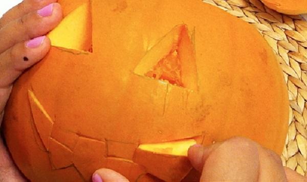 Agora desenhe o rosto assustador da abóbora. Com um marcador preto deve desenhar os traços faciais da abóbora de Halloween. Faça uns olhos e um nariz com forma triangular, e uma boca em zigue zague deixando a forma de dois dentes para lhe dar uma aparência ainda mais assustadora.