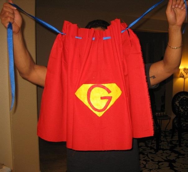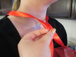 Quando toda a fita estiver entrelaçada nos cortes da capa, certifique-se de que fica sobrando de fora o mesmo comprimento de fita de um lado e do outro (deverão corresponder a 50 cm de cada lado), pois ela servirá para amarra a capa de bruxa ou de vampiro ao pescoço.