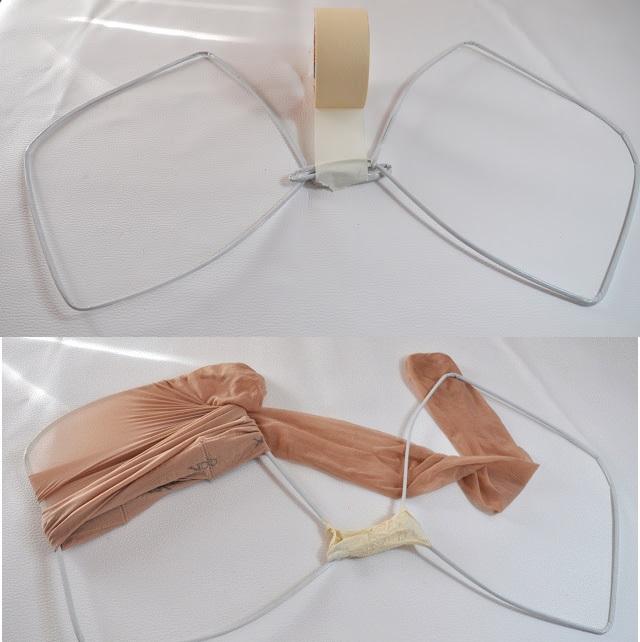 Outra parte muito importante da fantasia de sininho são as asas. Se não tem nenhumas por casa, o mais simples é fazer umas com cartolina branca que poderá recortar e colocar um cordão branco. Se conseguir, decore as suas asas com um pouco de algodão ou algum elemento brilhante, ficarão muito melhor. Outra forma simples de fazer as asas da fantasia de sininho é utilizando dois cabides de arame. Pegue em um cabide e puxe a base do mesmo até ficar com um losango. Faça o mesmo ao outro cabide. Coloque os cabides lado a lado e una-os torcendo os ganchos. Depois para não se magoar enrole com fita adesiva a parte em que os cabides estão unidos, como mostra na imagem. Agora vesta os cabides com uma meia-calça verde ou da cor que preferir e enrole o excesso de meia no centro.