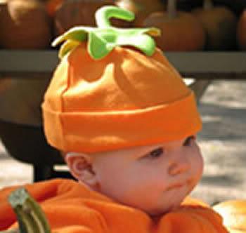 Se quiser também pode fazer um chapéu simulando o topo da abóbora. Para isso, pode utilizar um gorro laranja e costurar no topo umas folhas em tecido verde ou fazer o seu próprio chapéu da forma que desejar.