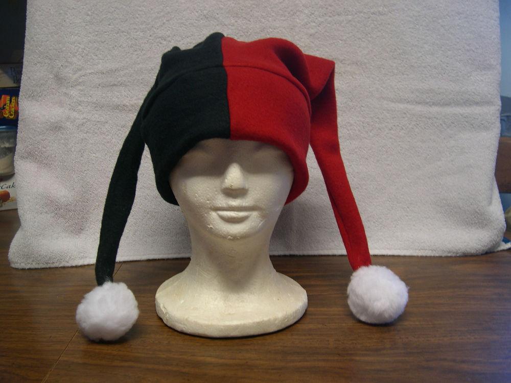 Para fazer o chapéu de Arlequina, deverá unir as metades restantes das leggings, uma vermelha e outra preta. Em cada perna da legging coloque algodão, não é preciso encher muito. Na ponta de cada perna costure um pompom de lã branca. Se o lado direito da camiseta for preto o lado direito do chapéu deverá ser vermelho e vice-versa.