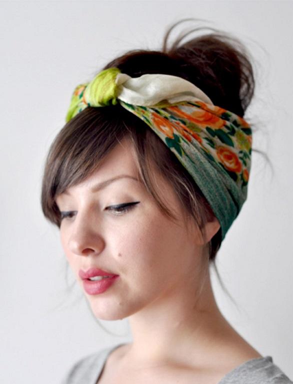 Agora vamos à imagem de marca do estilo de Carmen Miranda, o turbante de frutas na cabeça. Se você tiver algum turbante colorido em casa, basta usá-lo para a fantasia de Carmen Miranda. Caso não tenha nenhum, saiba que o pode fazer facilmente com um lenço. Entre no nosso artigo e descubra como amarrar um lenço à cabeça.
