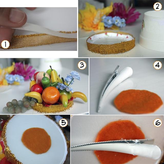 De seguida, com cola quente vá colando as frutas que reuniu na base do sorvete. Tenha em atenção ao colar para o peso ficar bem distribuído e deixe secar. Depois corte um círculo de feltro e cole em baixo da base do pote de sorvete. Agora pegue na sua fivela e coloque cola quente na parte superior da mesma e cole no pedaço de feltro. E já tem o seu arranjo de frutas feito para a sua fantasia de Carmen Miranda.