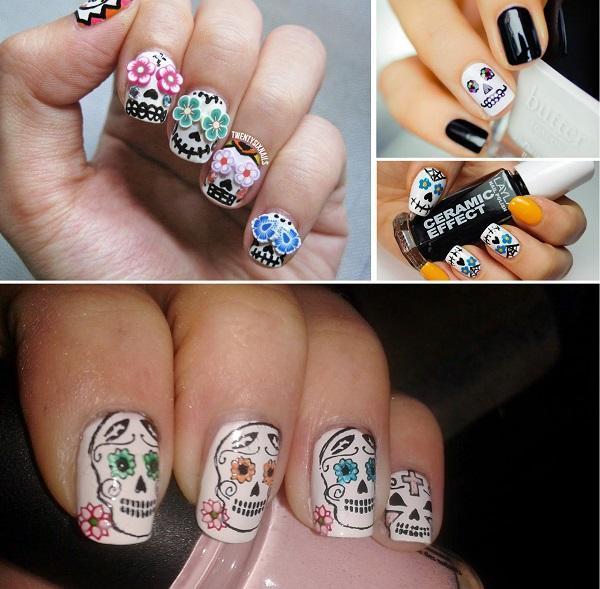 Já que a fantasia de caveira mexicana é sucesso no Halloween, ideal para conseguir uma aparência assustadora mas colorida e, por sua vez atrativa, já que o ponto forte é uma maquiagem muito elaborada repleta de ornamentos e muitos acessórios. Para dar um toque único ao seu look, nada melhor que umas unhas decoradas também ao estilo das caveiras mexicanas; confira e inspire-se nos espetaculares desenhos que mostramos na imagem.