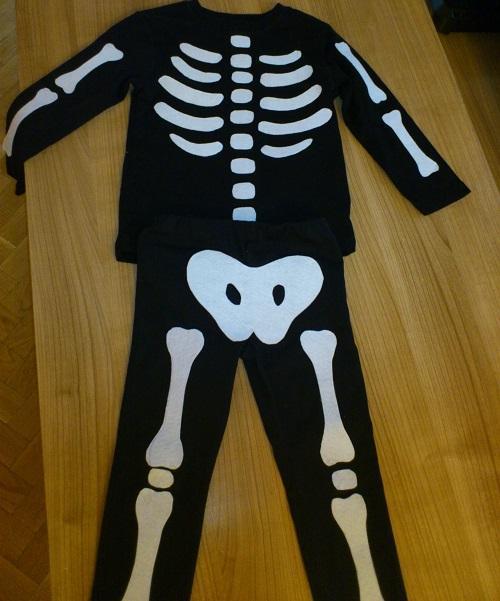 Já está quase a terminar a sua fantasia de esqueleto caseira. Agora, deverá apenas retirar o papel que protege o adesivo e colar os ossos na camiseta e nos leggings pretos nos pontos correspondentes.