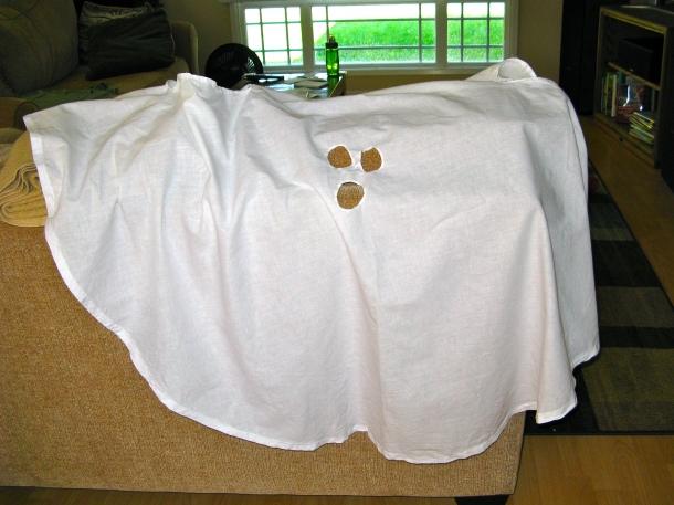 Retire o lençol de cima da pessoa e recorte os buracos para os olhos e para o nariz, com uma tesoura. Lembre-se que deverá recortar os buracos um pouco maiores que as marcações feitas a caneta, para o lençol não ficar assim marcado. Também é importante certificar-se que os olhos ficam nivelados.